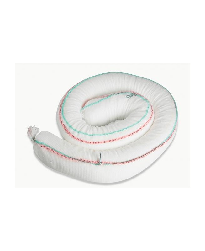 Barrage absorbant hydrocarbures, pure fibre de polypropylène, spécial dépollution. Avec filet PP très résistant, corde nylon de renfort, mousquetons et anneaux nylons pour connexion, 13 cm x 3 m. Sac de 4 barrages, capacité d'absorption de 252 L/sac ou 63 L/barrage.