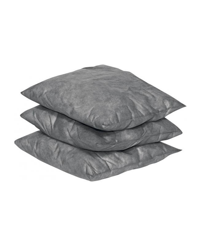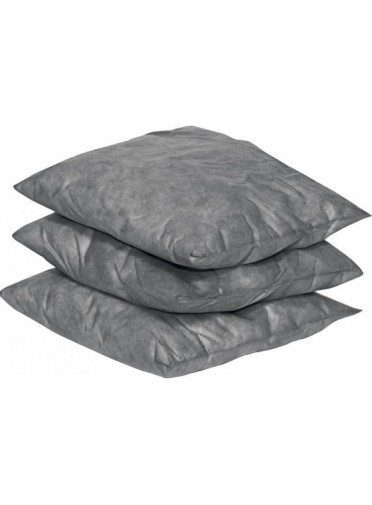 Coussin absorbant tous liquides, flocons de polypropylène dans enveloppe non tissée, 60 x 80 cm, couleur grise. Carton de 4 coussins, capacité d'absorption 140 L/carton ou 35 L/coussin.
