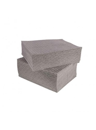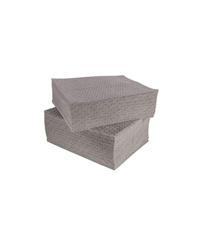Feuille absorbante tous liquides, pur fibre de polypropylène, simple épaisseur, non calandrée, prédécoupée, 40 x 50 cm, couleur gris. Carton de 200 feuilles (40 m2), capacité d'absorption : 135 L ou 0,67 L/feuille.