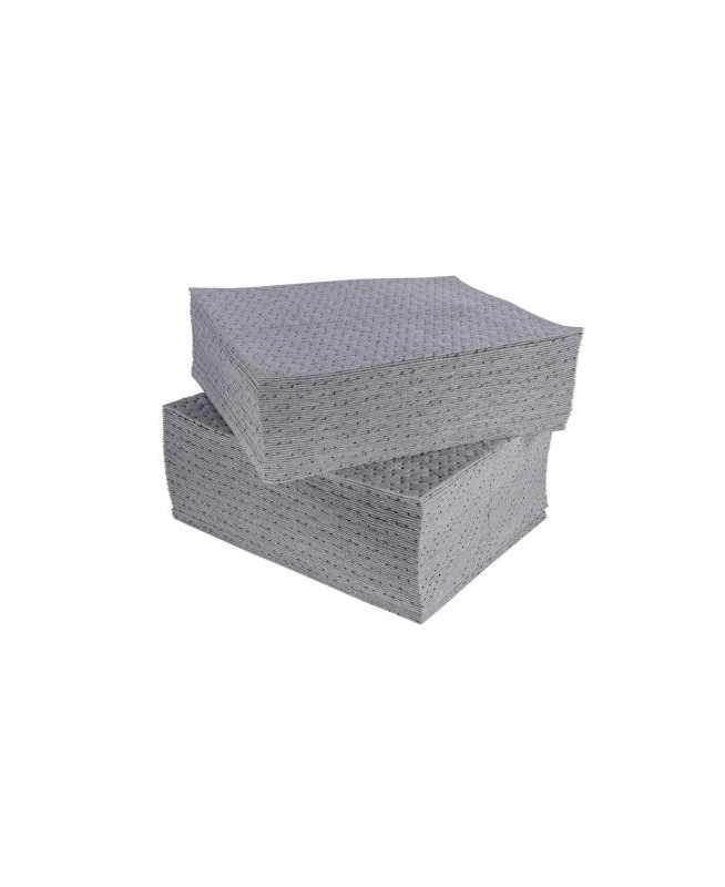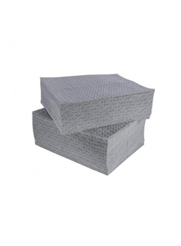 Feuille absorbante tous liquides, pur fibre de polypropylène, simple épaisseur, calandrée avec voile anti-peluches 1 face, prédécoupée, 40 x 50 cm, couleur grise. Carton de 200 feuilles (40 m2), capacité d'absorption : 120 L/carton ou 0,60 L/feuille.