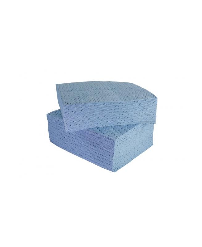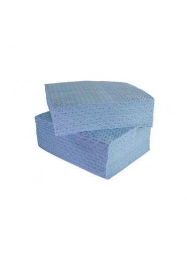 Feuille, absorbant hydrocarbures, pur fibre de polypropylène, double épaisseur, calandrée avec voile anti-peluches 1 face, prédécoupée, 40 x 50 cm, couleur bleu. Carton de 100 feuilles (20 m2), capacité d'absorption : 102 L/carton ou 1,02 L/feuille.