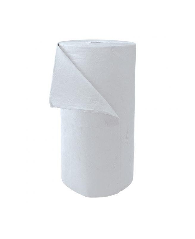 Rouleau absorbant hydrocarbures, pur fibre de polypropylène, spécial dépollution. Blanc, sans prédécoupe, double épaisseur, non calandré, 80 cm x 40 m. Sac de 1 rouleau (32 m2), capacité d'absorption 180 L.