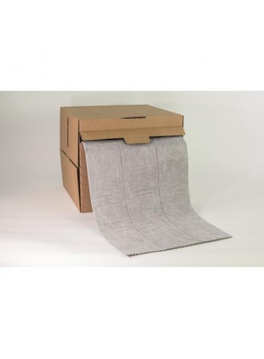 Rouleau absorbant tous liquides, pur fibre de polypropylène, double épaisseur, calandré, voile anti-peluches recto et verso, multi-découpe (2 en longueur, 1 en largeur au pas de 50 cm) 40 cm x 25 ML, couleur grise. Carton distributeur de 1 rouleau (10 m2), capacité d'absorption : 48 L.
