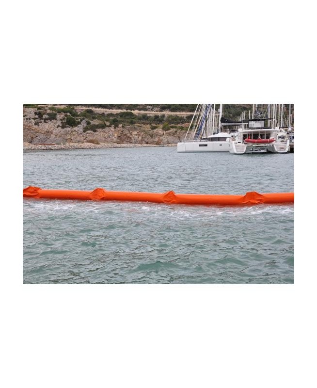 Barrage de confinement à flotteurs cylindriques. Mousse à cellules fermées ronde avec tissu polyester enduit PVC. Hauteur totale 650 mm. Tirant d'air 220 mm + tirant d'eau 430 mm. Connecteurs ASTM en aluminium de type Z aux extrémités, chaîne de lestage en bas de jupe. Longueur 25 m, Couleur orange, poids pour 1 m : 2,55 kg, poids total 63.75 kg.
