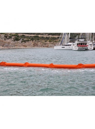 Barrage de confinement à flotteurs cylindriques. Mousse à cellules fermées ronde avec tissu polyester enduit PVC. Hauteur totale 850 mm. Tirant d'air 350 mm + tirant d'eau 500 mm. Connecteurs ASTM en aluminium de type Z aux extrémités, chaîne de lestage en bas de jupe. Longueur 25 m, Couleur orange, poids pour 1 m : 4,21 kg, poids total 105,25 kg.