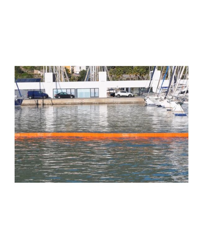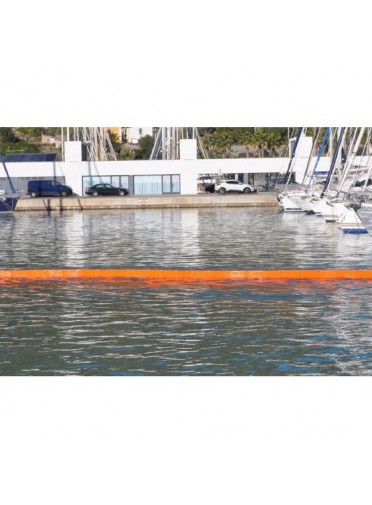 Barrage de confinement de type rideau plat. Mousse à cellules fermées de faible épaisseur avec tissu polyester enduit PVC. Hauteur totale 1000 mm. Tirant d'air 350 mm + tirant d'eau 650 mm. Longueur 25 m. Connecteurs ASTM en aluminium de type Z aux extrémités, chaîne de lestage en bas de jupe. Couleur orange, poids pour 1 m : kg, poids total kg