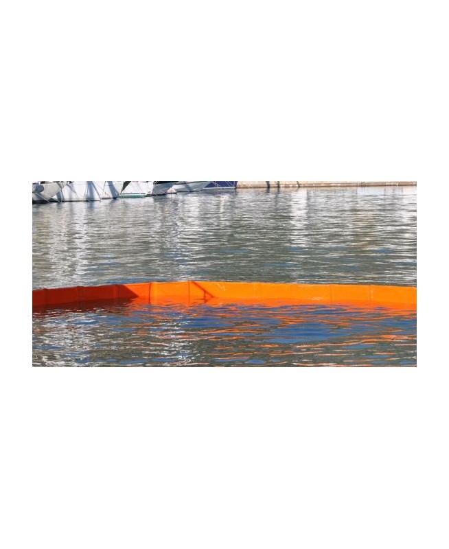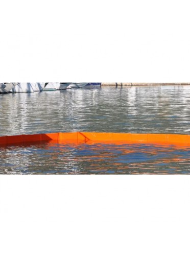 Barrage de confinement de type rideau plat. Mousse à cellules fermées de faible épaisseur avec tissu polyester enduit PVC. Hauteur totale 750 mm. Tirant d'air 270 mm + tirant d'eau 480 mm. Longueur 25 m. Connecteurs ASTM en aluminium de type Z aux extrémités, chaîne de lestage en bas de jupe. Couleur orange, poids pour 1 m : 3,94 kg, poids total 98,50 kg