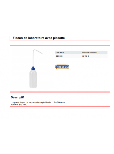 pissette polyethylene Longueur tuyau de vaporisation réglable de 115 à 260 mm.