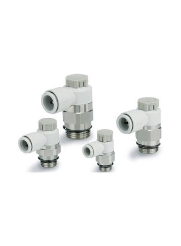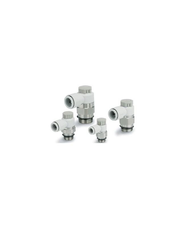 "Compatible avec les applications n'admettant pas le cuivree la serie ""-FG"" peut egalement ˆtre employee dans les environnements o— le rin‡age … grande eau pourrait endommager les contr“leurs de debit standards comme dans les applications de conditionnement ou dans l'industrie alimentaire Cette serie a ete con‡ue pour offrir un contr“le maximal en augmentant le nombre de tours de la vis de reglage jusqu'… 10 Le corps et le regleur sont en resine blanche hautement resistante aux impacts pour un aspect propre Cette serie inclue egalement les raccords instantanes de SMC qui sont disponibles pour des diamŠtres externes de tube allant de 4 … 12 mm "