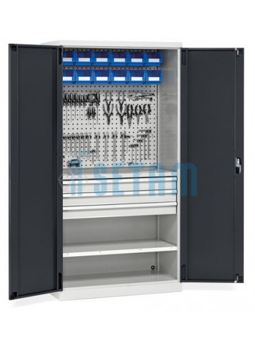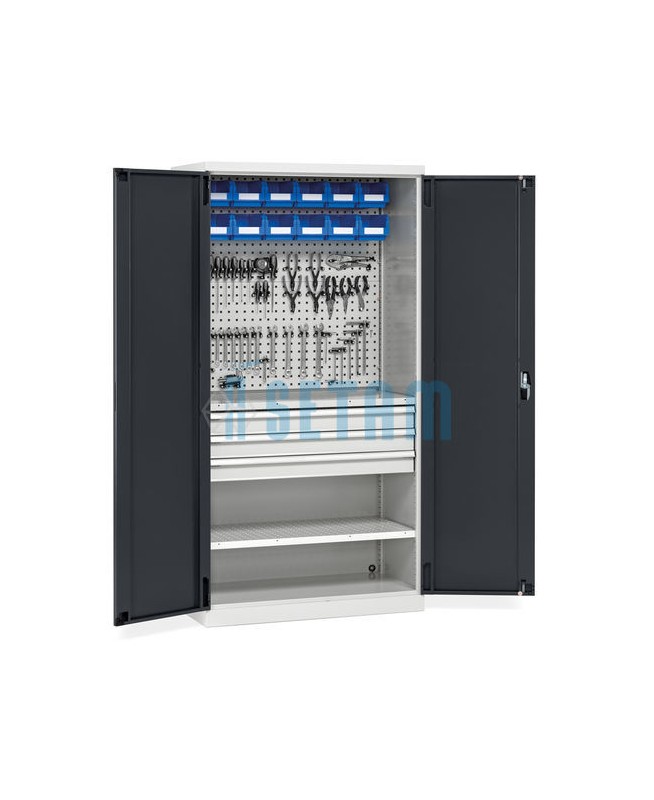 Armoire professionnelle Mont Cenis n°5 avec panneaux perforés, 2 tablettes perforées + 3 tiroirs simple extension