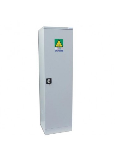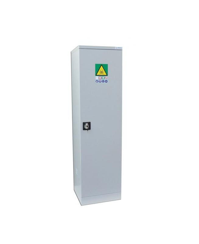 Armoire de sécurité pour produits phytosanitaires, conforme à la règlementation, pictogramme normalisé, acier avec peinture grise, orifices de ventilation, 1 porte manuelle avec serrure, 4 étagères réglables en hauteur avec rétention (10 L) dont 1 à poser au sol. Capacité de stockage maxi : 130 L. Dimensions : 500 x 420 x H1800 mm, 41 kg.
