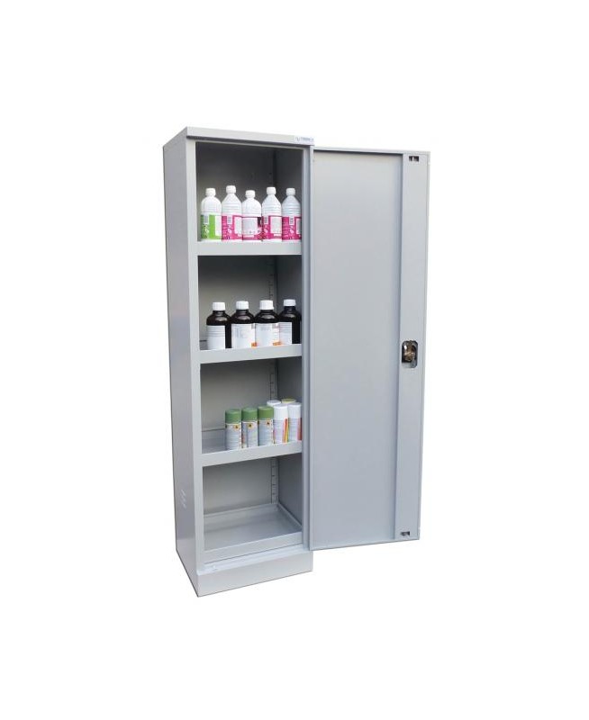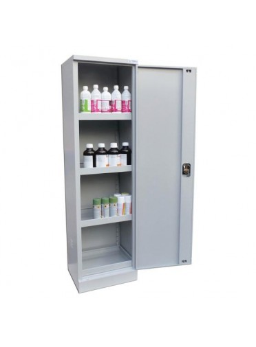 "Armoire de sécurité haute 1 porte, acier simple paroi. Capacité de stockage de 130 L. Fermeture manuelle avec serrure à clé. Ventilation naturelle en parties latérales. 3 étagères acier réglables en hauteur, 1 bac de rétention au sol. Capacité de rétention totale de 40 L. Dimensions : 500 x 420 x H1800 mm, poids 41 kg, couleur grise. Avec pictogramme normalisé à coller ""Toxique""."