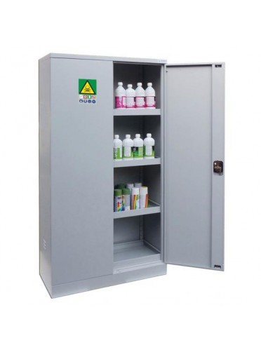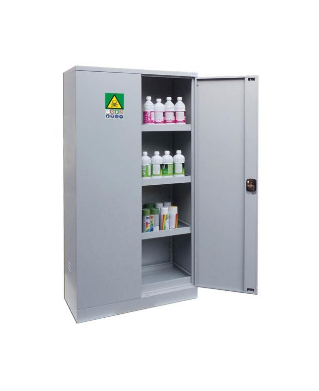 Armoire de sécurité pour produits phytosanitaires, conforme à la règlementation, pictogramme normalisé, acier avec peinture grise, orifices de ventilation, 2 portes manuelle avec serrure, 4 étagères réglables en hauteur avec rétention (20 L) dont 1 à poser au sol. Capacité de stockage maxi : 240 L. Dimensions : 920 x 420 x H1800 mm, 60 kg.