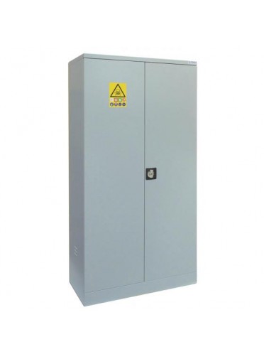 Armoire de sécurité pour produits Toxiques, pictogrammes normalisés, acier avec peinture grise, orifices de ventilation, 2 portes manuelle avec serrure, 4 étagères réglables en hauteur avec rétention (20 L) dont 1 à poser au sol. Capacité de stockage maxi : 240 L. Dimensions : 920 x 420 x H1800 mm, 60 kg.