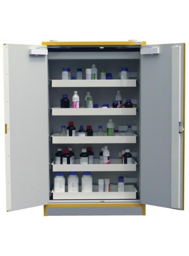 Armoire de sécurité pour produits inflammables, coupe-feu 30 minutes certifiée selon EN14470-1 et FM 6050, avec 4 tiroirs bac de rétention coulissant (4 x 28 L). Construction en panneaux isolants, 2 portes à fermeture automatique grâce au thermo-fusible. Dimensions : 1115 x 550 x H1980 mm, poids 258 kg, coloris gris et jaune.