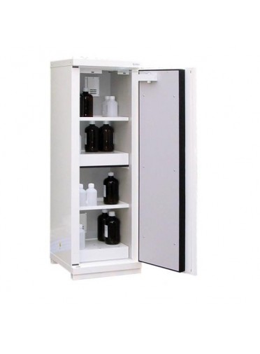 Armoire de sécurité pour produits inflammables, coupe-feu 90 minutes certifiée selon EN14470-1 et FM 6050 avec 2 compartiments, stockage 2 x 55 L. Construction avec panneaux isolant. 1 porte à fermeture automatique grace au thermo-fusible (50°C). Par compartiment : étagère réglables (acier) et 1 bac de rétention. Dim. extérieures : 635 x 615 x 1880 mm, poids 304 kg, coloris blanc.
