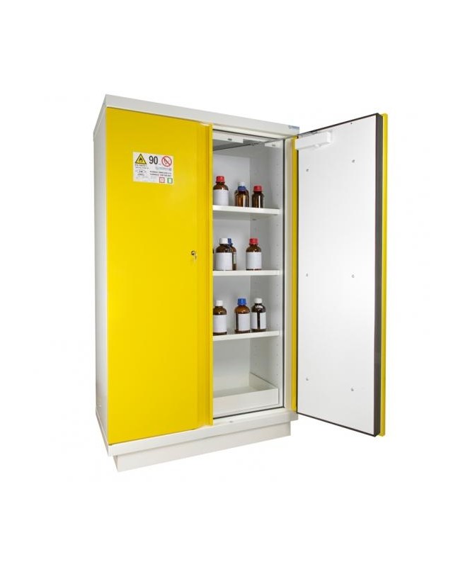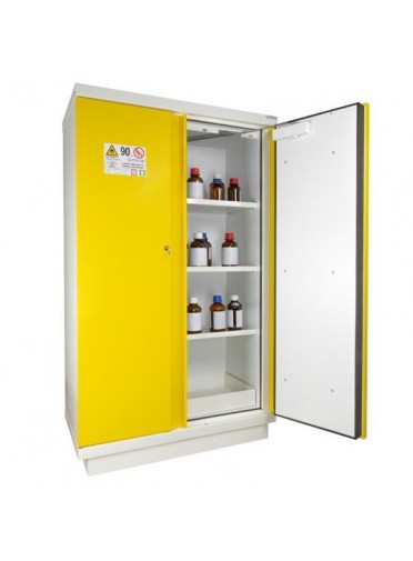 Armoire de sécurité pour produits inflammables, coupe-feu 90 minutes certifiée selon EN14470-1 et FM 6050, construction avec panneaux isolants, 2 portes à fermeture automatique grâce au thermo-fusible (50°C), 3 étagères réglables (acier) - 1 bac de rétention au sol. Dimensions : 1135 x 615 x H1880 mm, poids 453 kg, coloris armoire blanche et portes jaunes.