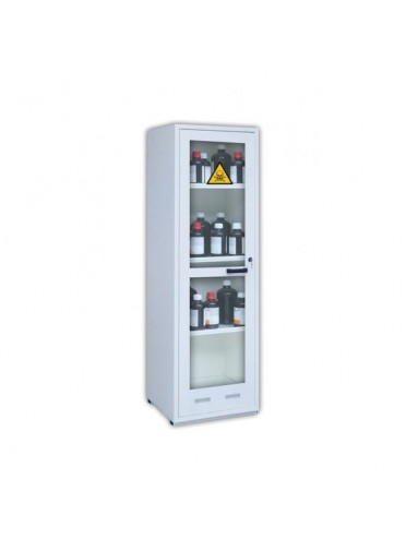 Armoire de sécurité, 1 compartiment avec porte vitrée, pour stockage 150 L produits toxiques ou inflammables, acier simple paroi. Portes à fermeture manuelle, serrure à clé, 3 étagères de rétention, 1 bac de rétention. Ventilation naturelle. Dimensions : 560 x 545 x 1825 mm, poids 55 kg, couleur blanche.