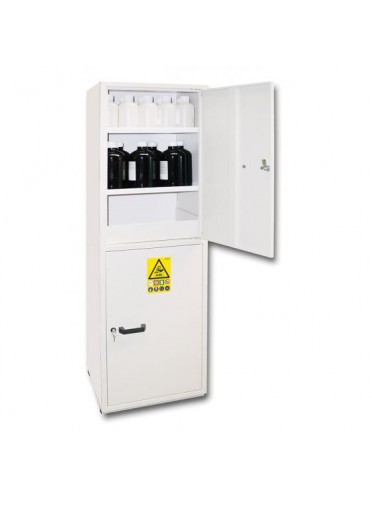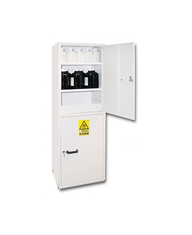 Armoire Multirisques, 2 compartiments (Acides et Bases). Acier , peinture Epoxy, pictogrammes normalisés. 2 portes battantes à fermeture à clef. Dim. ext. : 560 x 545 x H1825 mm, Stockage : 2 x 55 L, rétention : 2 x 35 litres. Coloris blanc, poids : 95 kg
