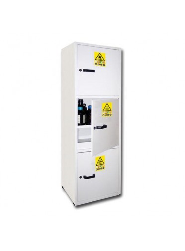 Armoire de Sureté Multirisques, 3 compartiments (Acides, Bases, Solvants). Acier , peinture Epoxy, pictogrammes normalisés sur chaque compartiment. 3 portes battantes à fermeture à clef. Dim. ext. L560 x P500 x H1825 mm, capacité totale rétention : 138 litres.