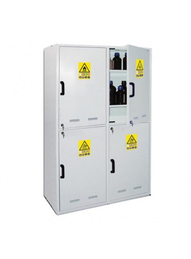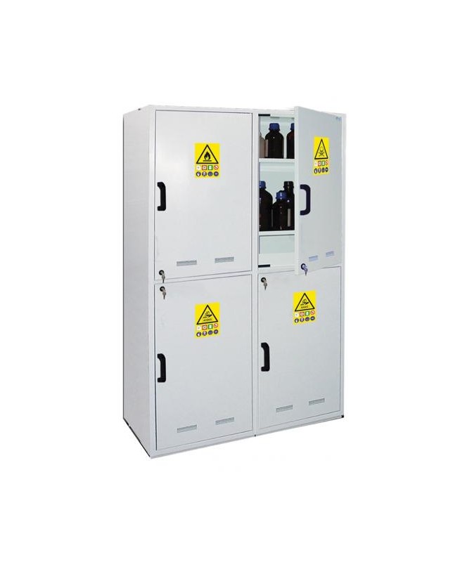 Armoire de Sureté Multirisques, 4 compartiments (Acides, Bases, Solvants et Toxiques). Acier , peinture Epoxy couleur gris clair. Pictogrammes normalisés sur chaque compartiment. 4 portes battantes à fermeture à clef. Dim. : L1120 x P500 x H1825 mm, capacité totale rétention : 184 litres.