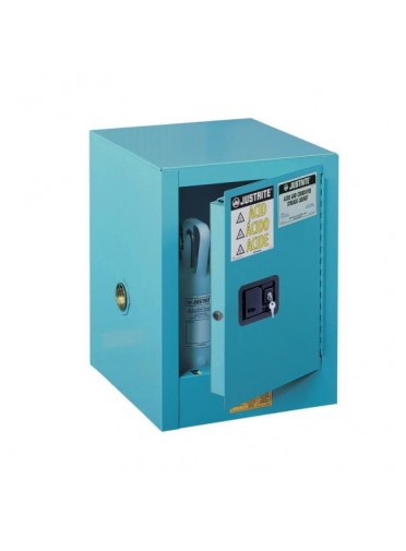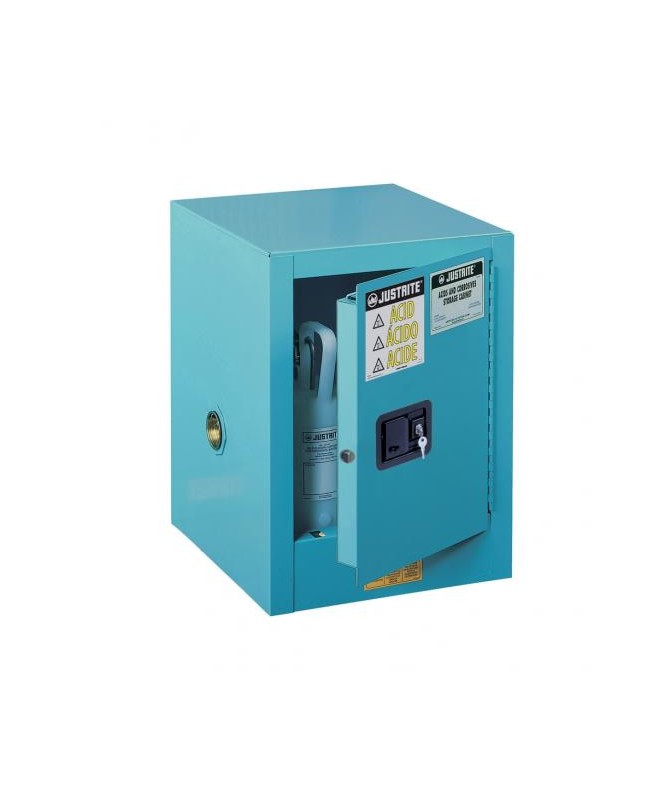 Armoire de sécurité bleue pour produits corrosifs, agréement FM, double paroi, avec 1 porte, à fermeture automatique + thermofusible, équipée d'une poignée encastrée Sure-Grip et d'une étagère, bac de rétention en partie basse - Dim. ext : ht 600 x 430 x 430 mm.