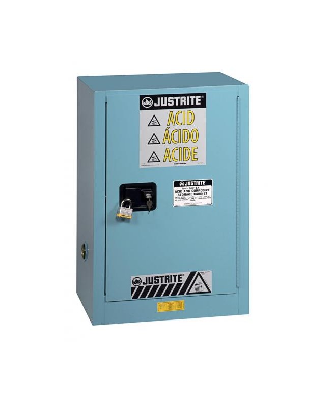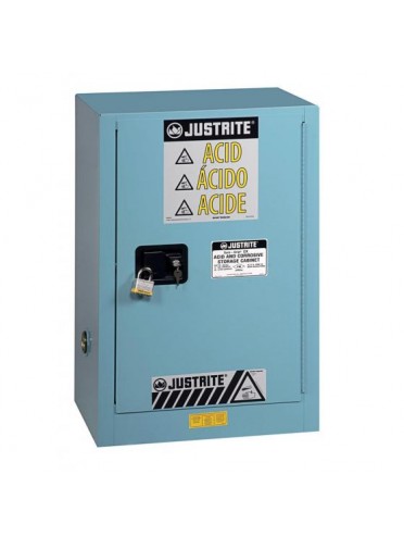 Armoire de sécurité bleue pour produits corrosifs, agréement FM, double paroi, avec 1 porte, à fermeture automatique + thermofusible, équipée d'une poignée encastrée Sure-Grip et d'une étagère, bac de rétention en partie basse - Dim. ext : ht 890 x 590 x 460 mm.