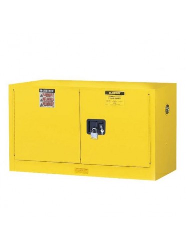 Sur armoire de sécurité jaune pour produitsinflammables, agréement FM, double paroi, avec 2 portes à fermeture automatique + thermofusible, équipée d'une poignée encastrée Sure-Grip et une étagère, bac de rétention en partie basse - Dim. ext : ht 610 x 1090 x 460 mm - int. : ht 460 x 1010x390 mm