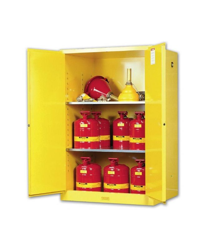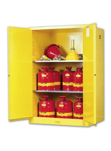 Armoire de sécurité jaune pour produits inflammables, agréement FM, double paroi, avec 2 portes à fermeture automatique + thermofusible, équipée d'une poignée encastrée Sure-Grip et de 2 étagères, bac de rétention en partie basse - Dim. ext : Ht 1650 x 1090 x 860 mm- int. : ht 1500 x 1010 x790 mm