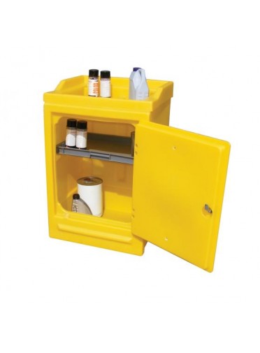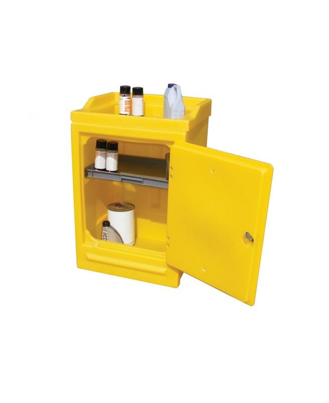 Armoire de stockage en polyéthylène jaune, support pour produits sur le dessus, porte avec serrure en partie basse avec 1 étagères PE amovible. Poid 23 Kg. Dim 640 x 580 x 980 mm. Capacité de stockage 100 litres.