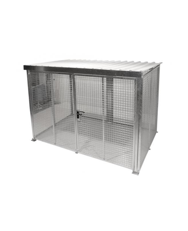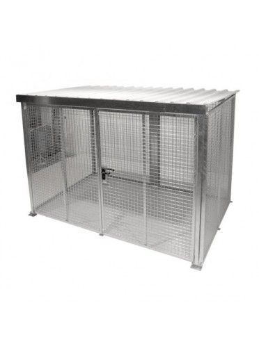 Abri grillagé pour le stockage de bouteilles de gaz, capacité 104 bouteilles type B50. Fabrication en acier galvanisé sans plancher avec double porte battante verrouillable à clé. Dimensions : 3100 x 2100 x H2180 mm, poids 349 kg. Livré en kit. (merci de nous consulter)