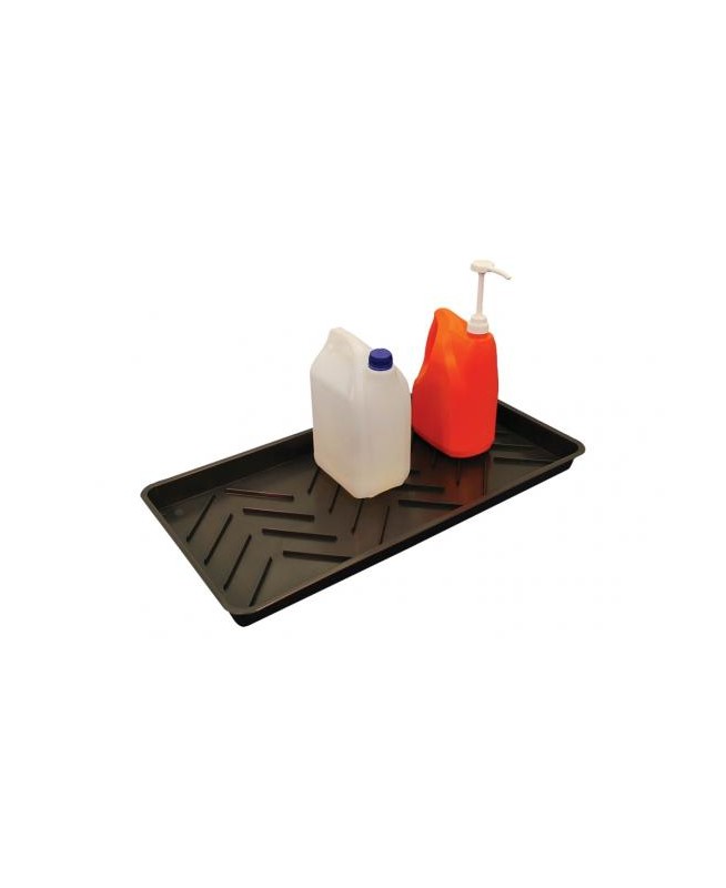 "Bac, polyéthylène, rétention de 11 litres, sans caillebotis. Dim. : 790 x 400 x H50 mm, poids : 1.2 kg, couleur : noir.