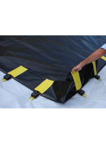 Bac de rétention souple avec équerres intégrées, capacité 5432 L. Système breveté : les equerres se plient et se déplient à 90° sur simple pression. Facile à ranger et à transporter. Tissu avec revêtement PVC. Dimensions : 3700 x 4900 x H305 mm, coloris noir et jaune.