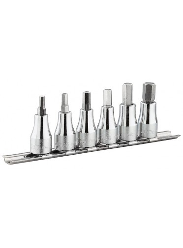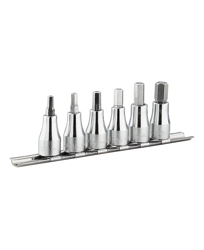 "JEU DE 6 DOUIL-TVIS 3/8' RACKJeu de 6 Douille-tournevis 3/8"" 6 pans creux métrique sur rack de 4 à 10 mm- -embout amovile de grande dureté pour plus de longévité - Douille-tournevis chromée brillante et embout phosphaté - FACOM JT.40 MULTIPLE DE : 1"