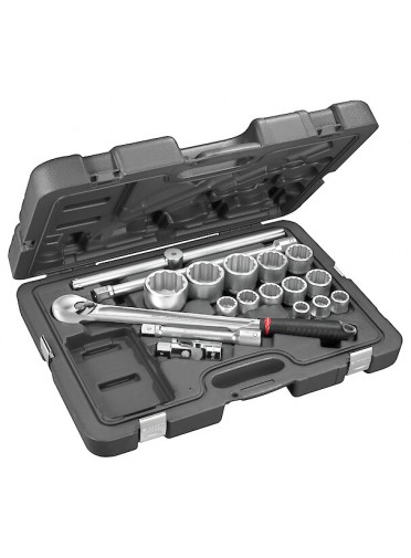 "COFFRET 3/4 DOUILLES 12P+CLIQUCoffret douilles 3/4"" 12 pans - cliquet - 13 douilles de19 à 55 mm -2 x rallonges - 1 x poignée coulissante - 1 x cardan - coffret plastique - FACOM KL.501 MULTIPLE DE : 1"