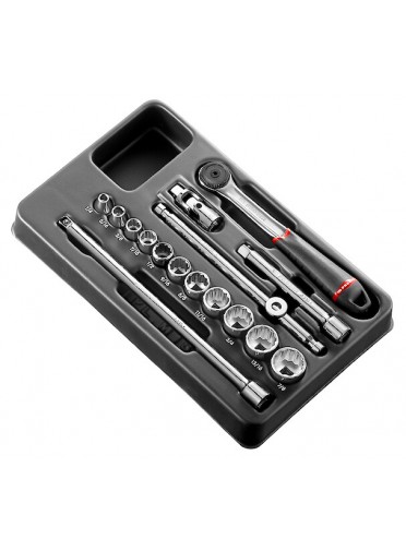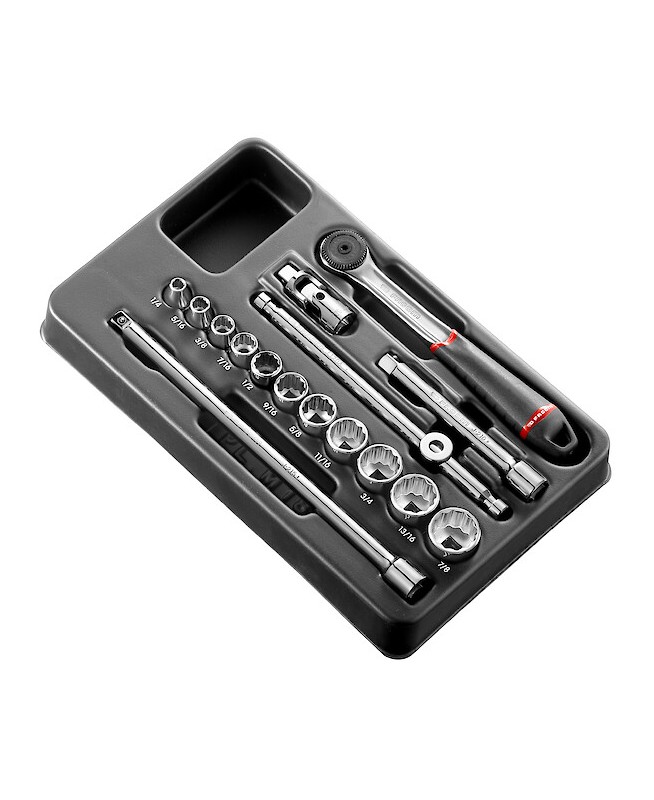 "MOD DOUIL 3/8' 12P IN J.161B 16PCModule douilles 3/8"" 12 pans pouce 16 pièces - 1 x cliquet - 11 x douilles de J.1/4"" à 7/8"" - 2 rallonges - 1 x cardan- 1 x poignée coulissante - plateau thermoformé - FACOM MOD.J161-212U MULTIPLE DE : 1"