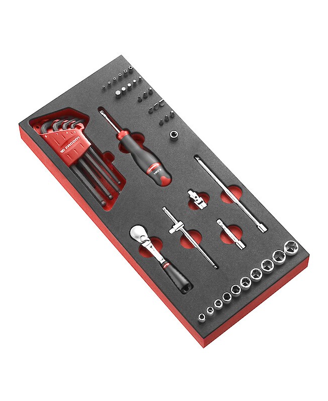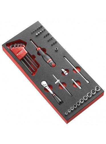 "MOD MOUSSE DOUIL 1/4' 6P MM RL.161 46PCModule mousse douilles 1/4"" 6 pans métrique 46 pièces - cliquet - 10 douilles de 5,5 à 14 mm - rallonges - cardan - poignée coulissante - poignée tournevis - embouts de vissage- clés males 6 pans - FACOM MODM.RL161-36 MULTIPLE DE : 05"