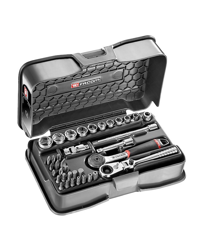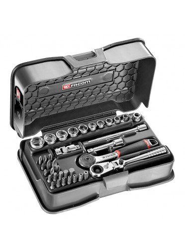 "COFFRET DOUIL 1/4' 6P MM R.180HX 37PCCoffret de douilles 1/4"" métriques - 37 pièces - douilles 6 pans de 5.5 6 7 8 9 10 11 12 13 14 mm- cliquet - cliquet traversant tête orientable - 2 rallonges - douille porte-embout - cardan - 21 embouts - FACOM R.161-6P6HX MULTIPLE DE : 1"