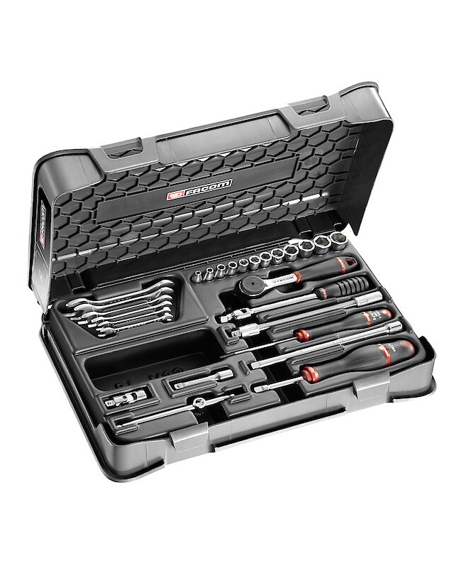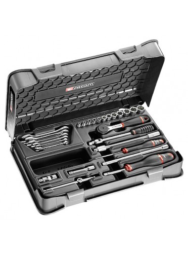 "COFFRET DOUIL CLES 1/4' MM R.161B 27PCCoffret cliquet douilles radio 6 pans 1/4"" avec accessoires + clés fourches série 22 3,2 à 13 mm - FACOM R.430BP MULTIPLE DE : 1"