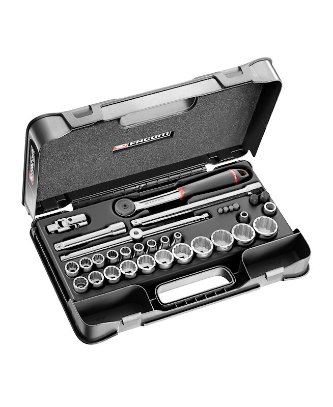 "COFFRET DOUIL 1/2' 12P MM S.161B 33PCCoffret douilles 1/2"" - 12 pans - 35pièces - métrique - cliquet étanche S.161B - 22 douilles S - 2 rallonges 130 et 250 mm - cardan - poignée coulissante - 2 douilles porte-embouts - coffret vide BP.MBOXL - FACOM S.446ADP MULTIPLE DE : 1"