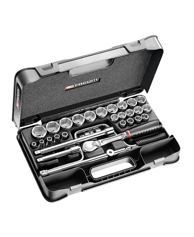 "COFFRET DOUIL 1/2' 6P MM SL.161 30PCCoffret à douilles 1/2"" métriques - cliquet 1/2"" étanche hautes performances - 30 pièces - douilles 6 pans 1/2"" de 8 à 34 - 2 rallonges - 1 poignée coulissante 1/2"" - FACOM SL.161-5P6 MULTIPLE DE : 1"