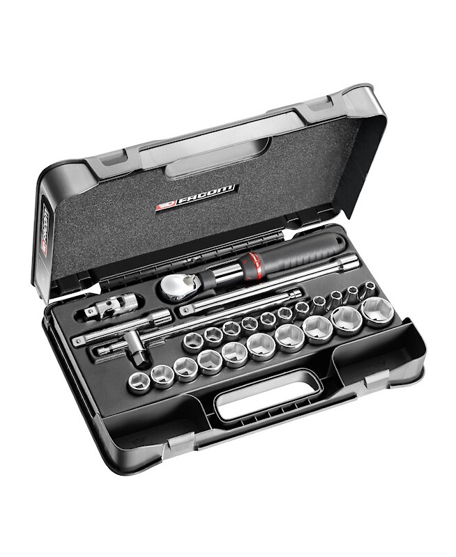 "COFFRET DOUIL 1/2' 6P MM SXL.161 26PCCoffret à douilles 1/2"" 6 pans métriques - 26 pièces - douilles de 8 à 32 - cliquet 1/2"" étanche hautes performances - 2 rallonges - 1 poignée coulissante - 1 cardan universel - FACOM SXL.161-4P6 MULTIPLE DE : 1"