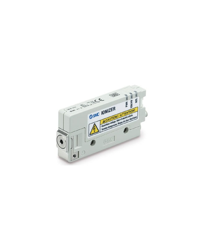 The IZN10E is SMC's nozzle ionizer The nozzle ionizer emits an air-assisted cone of static eliminating ions for focused targets 2 inches or smaller up to 20 inches away The nozzle can be used with an optional sensor and monitor to suspend emission when static elimination is complete or when the target is not present Available with a high flow or enery saving nozzle or female threads to attach an accessory The cartridge can be removed without tools for needle cleaning or replacement Slim compact design is suitable for installation in tight spaces