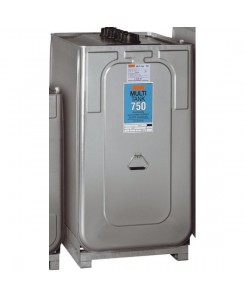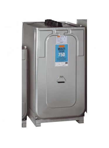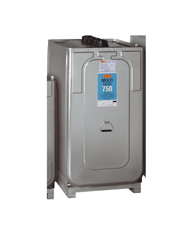 "Cuve double paroi (cuve interne en PEHD, paroi extérieure en acier galvanisé), pour stockage de gasoil, capacité 750 l, socle pieds en acier galvanisé solidaire, indicateur de niveau, contrôle visuel de fuites, 4 orifices 2"", poignée de transport (à vide) - Dim. 980 x 770 x 1420 mm - Poids : 66 kg. "
