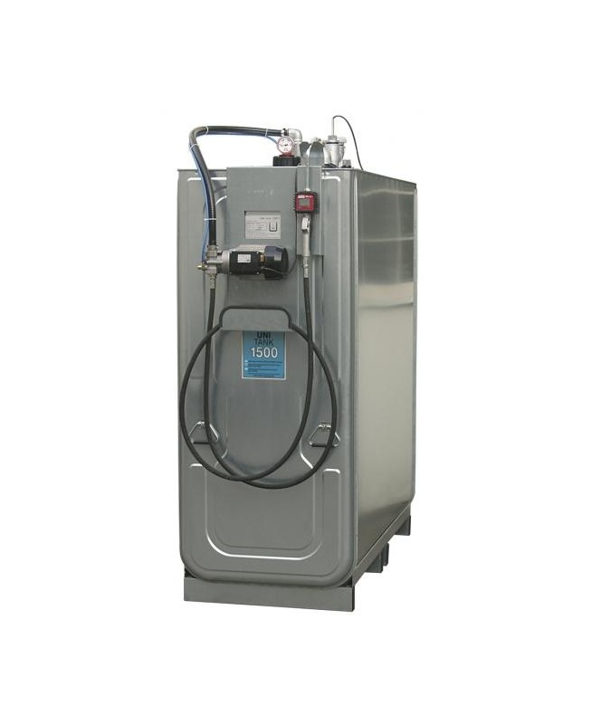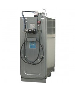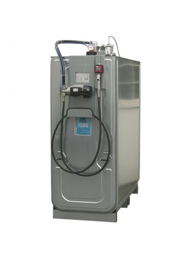 "Cuve double paroi (cuve interne en PEHD, paroi extérieure en acier galvanisé) pr stockage de gasoil, capacité 1500 l, socle palette , ind. de niveau, contrôle visuel de fuites, 4 orifices 2"", poignée de transport (à vide). Pompe électrique sur platine 230 V à amorçage automatique, supp. pistolet, compteur mécanique, 4 m de tuyau (filtre en option) - Dim. 2010 x 770 x 2020 mm - Poids : 176 kg"