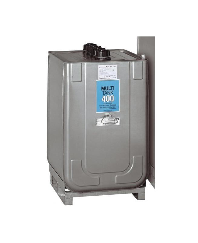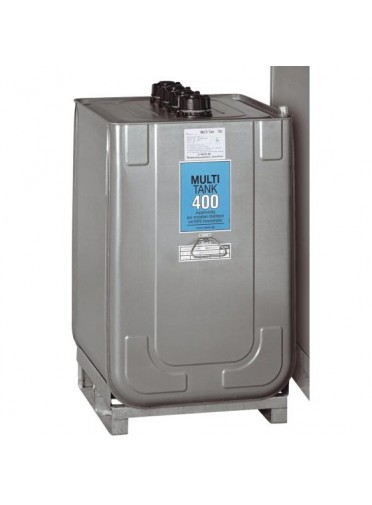"Cuve de stockage de 400 litres équipé pompe de distribution. Cuve double paroi (cuve interne en PEHD, paroi extérieure en acier galvanisé). Pompe électrique centrifuge 230 V, débit 40 L/min avec pistolet simple et tuyau de distribution de 4 mètres. 4 orifices 2"", poignée de transport (à vide) - Dim. 730 x 700 x 1420 mm - Poids : 55 kg. A utiliser en intérieur ou sous abri."