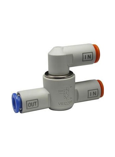 La série VR1210/1200 de sélecteur de circuit est une série de vannes 3/2 dotées d'une sortie et de deux entrées et de deux signaux pneumatiques La sortie est toujours alimentée par une pression d'entrée élevée La série VR12**F est une série d'interrupteurs servant au contrôle des conduites du système de signaux de pression pneumatique Le raccordement est possible en tout point et les raccords instantanés simplifient le raccordement Les temporisateurs de la série VR2110 combinent un orifice réglable et un débit déterminé ce qui leur permet de transmettre le signal pneumatique après que le temps fixé se soit écoulé