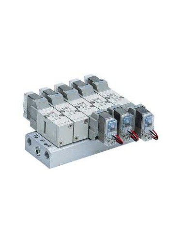 La série VF d'électrodistributeurs 5/2 et 5/3 à pilote offre une grande capacité de débit dans un volume compact La série VF est disponible dans de nombreuses versions dont trois commandes manuelles et quatre types de connexion électrique L'échappement commun pour la vanne principale et la vanne à pilote est également disponible