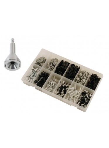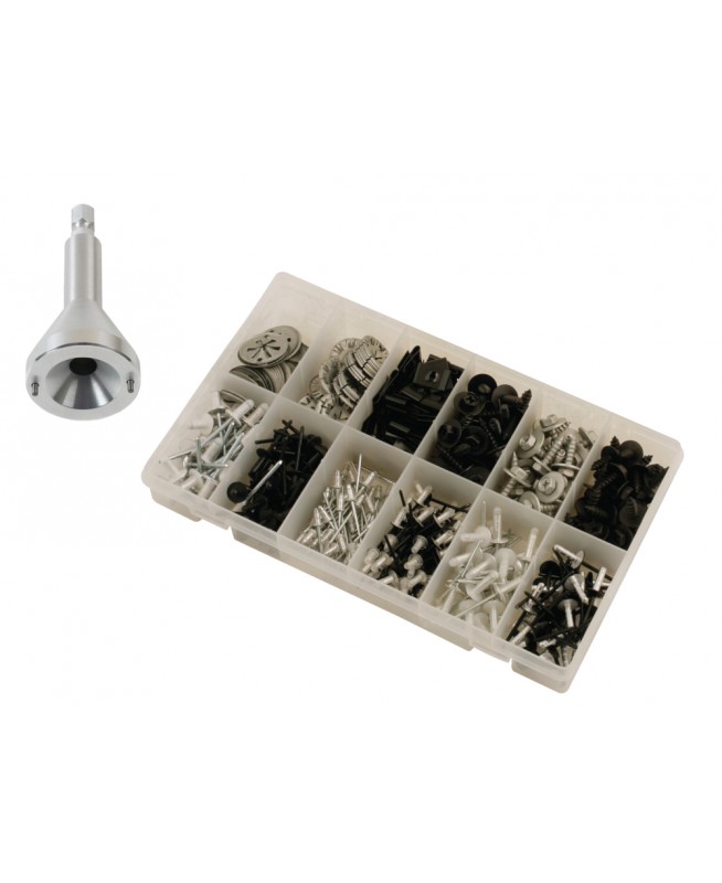 Lot d'un outil de démontage pour agrafes de fixation et assortiment d'attaches m
