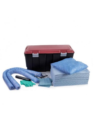 Kit d'intervention pour hydrocarbures, capacité d'absorption 75 litres. Contenant : box PE noir à couvercle avec roulettes et poignée (805x 430 x 380 mm). Contenu : 50 feuilles double épaisseur 40 x 50 cm, 2 boudins 0,8 x 1,2 m, 1 coussin 40 x 40 cm, 10 feuilles d'essuyage 32 x 38 cm, 1 paire de gants nitrile, 1 paire de lunettes et 3 sacs de récupération 50 L.